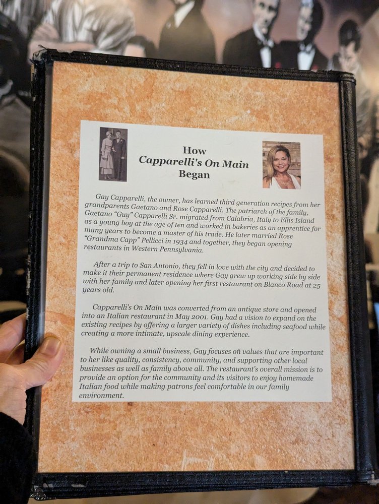 "Capparelli's On Main is a charming Italian restaurant located in San Antonio, TX. Owned by Gay, this cozy spot offers a classic menu with generous portions at modest prices. The retro interior exudes a sense of class and respectability. Customers rave about the flavorful dishes, with highlights like the lasagna, pizza, spaghetti, and garlic butter sauce. The friendly service and welcoming ambiance make dining here a delightful experience. Whether you're in the mood for seafood, desserts, or traditional Italian fare, Capparelli's On Main is a must-visit destination for a delicious meal."