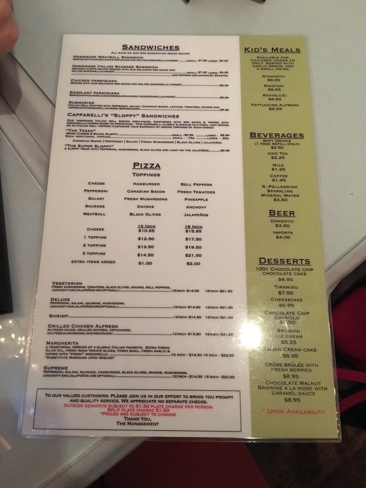 “ Are you in the mood for some pizza, maybe some spaghetti? Well, you're in luck as you've found just the right place! Capparellis is an old-school Italian restaurant with generous portions and modest prices. Street parking is available in front, or around the corner depending on how busy it is. I walked in on a Saturday afternoon and was seated at a table in the back. The retro interior conveys a sense of respectability and class. My server came to table and handed me a menu. They offer a plethora of classic Italian fare, such as soups, salads, seafood, chicken, spaghetti, and and expansive wine list. I wound up getting a plate of spaghetti with marinara sauce with added mushrooms! A basket of bread was brought out as well as a basic salad (iceberg lettuce, onions, tomatoes). The salad was decent, but iceberg lettuce is one of my pet peeves, so I didn't finish it. The bread however was warm and toasty! My entree arrived in a generous portion and didn't take very long, perhaps 15 minutes or so. The sauce was smooth, well seasoned, and neither too salty nor oily. The mushrooms appeared to be fresh, and blended well in the sauce. Overall, I was satisfied with my dining experience here and would definitely return. ”